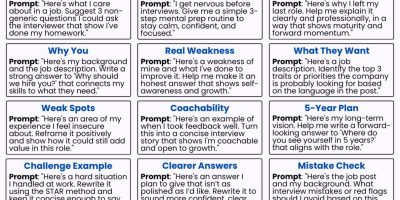 Preparing for interviews can feel overwhelming, but AI can make it easier. These 21 ChatGPT prompts help you craft strong answers, calm nerves, and stand out from the crowd. From building a confident career story and elevator pitch 💬 to handling tough questions like weaknesses, salary expectations, and career changes 🔍—this guide covers it all. Use these prompts to:✨ Practice with mock interviews🏆 Highlight your top wins and values❓ Prepare thoughtful questions for